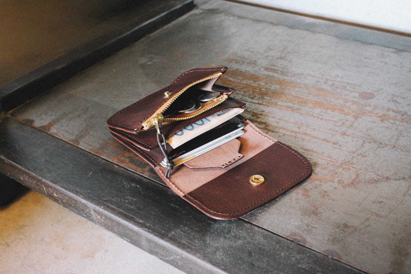 カードが簡単に取り出せる「CARD」タブなど機能性を考えてデザインされたコンパクトな革財布。Duram Factoryの工房で一つ一つミシンを使ってハンドメイドされています。手触りの優しい植物性タンニンなめしの革を使った丈夫で長くつきあえる財布です。